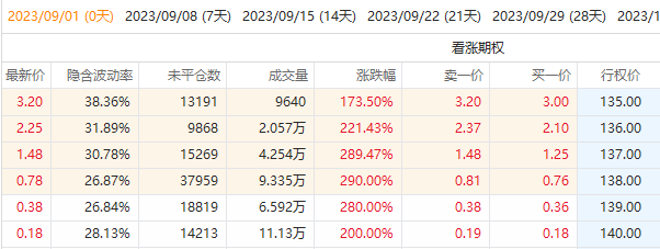 期权链上最活跃的是今晚到期、138美元行权的Call,成交约9.34万张,未平仓约3.8万张;其次是今晚到期,139美元行权的Call,成交约6.59万张,未平仓有1.88万张。另有多张Call单大赚2倍以上。