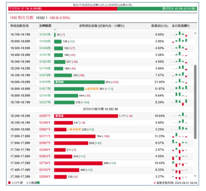 街货分布方面,至周四,恒指牛证街货重货区间主要在收回价17800点至18300点之间,累计相当约3143张期指合约;恒指熊证街货重货区主要在收回价18700点至19200点之间,累计相当约2636张期指合约。