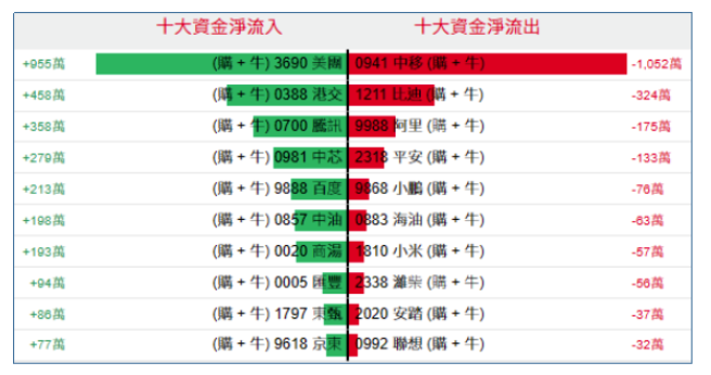 好仓(认购证及牛证)方面,周四美团、港交所、腾讯等相关好仓单日分别获得955万港元、458万港元、358万港元资金净流入;中移、比亚迪、阿里分别获得1052万港元、324万港元、175万港元资金净流出。