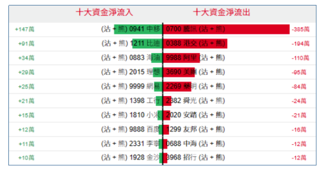 淡仓(认沽证及熊证)方面,周四中移相关淡仓单日获147万港元资金净流入,腾讯、港交所、阿里相关淡仓单日分别获385万港元、194万港元、110万港元资金净流出。