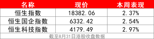恒生指数本周涨2.37%,报18382.06点;国企指数本周涨2.54%,报6332.42点;恒生科技指数本周涨1.29%,报4058.95点;