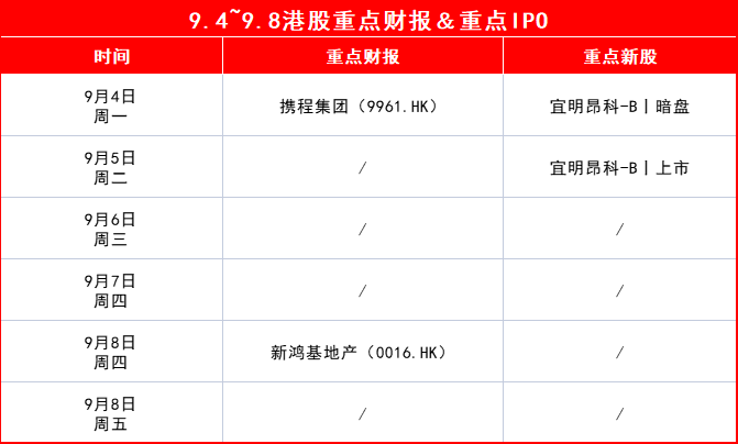下周港股财报季接近尾声,周二携程集团-S将公布业绩,周四关注新鸿基地产。