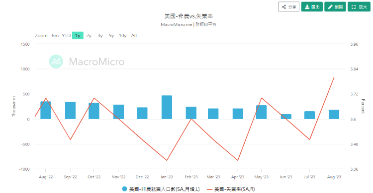美国公布7月份JOLTS 职位空缺减少至882.7万个,远少过预期946.5万个及上月916.5万个。为自2021年1月以来最低,更连续3个月减少。ADP私人就业职位,8月份仅增加17.7万个,远少过预期19.5万个,及上月经修订后的37.1万个。同月份非农就业新增职位增加18.7万个,略多过预期17万个及上月经修订后的15.7万个。同月份失业率意外升上3.8%,高过预期及上月3.5%。数据反映劳动市场稍见放缓。