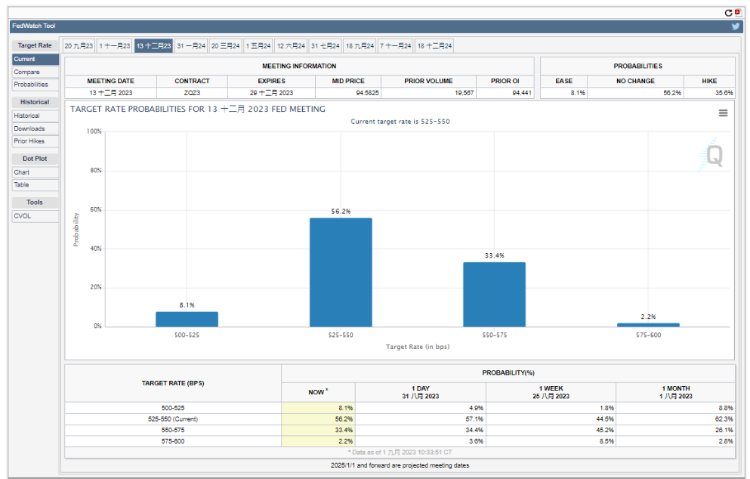 联储局主席鲍威尔在Jackson Hole 全球央行年会的演说指出,当地通胀虽已由高位回落,但跟目标2%仍有相当距离。因此在适当时候,也会继续加息,或保持在高位一段时间。多项经济数据皆差预期,反映经济渐见放缓增长。投资者更认定加息周期应近终止。在芝加哥商品期货交易所内的加息机会率,显示年底前的加息由早前超过4成,回落至33%。