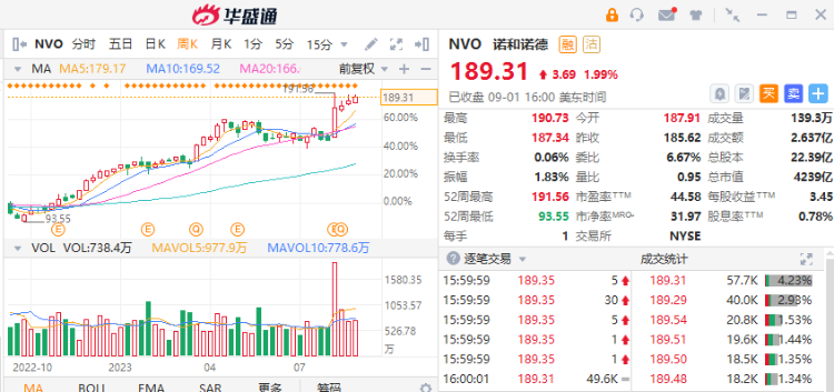 诺和诺德的美股市值上周五才超越LVMH,成为欧洲市值第一高的上市公司。受到登陆英国消息带动,诺和诺德在丹麦交易的股票周一收涨1.99%,再创历史新高。从K线路不难看出,从2021年开始,美股和欧股的股价差不多都翻了3倍。