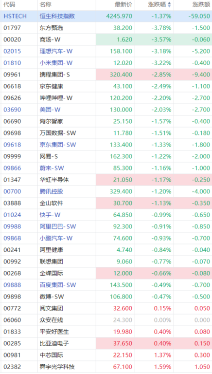 科指成分股多数下跌,东方甄选、商汤、理想汽车、小米跌超3%,携程、京东健康、哔哩哔哩、美团跌超2%,京东、网易、蔚来、腾讯跌超1%,快手、阿里巴巴、小鹏汽车小幅走弱。