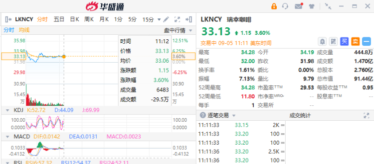 9月5日美股盘中,瑞幸咖啡 $LKNCY 涨3.6%,报33.13美元。据瑞幸咖啡官微消息,“酱香拿铁”单品首日销量突破542万杯,单品首日销售额突破1亿元,刷新瑞幸咖啡单品记录。
