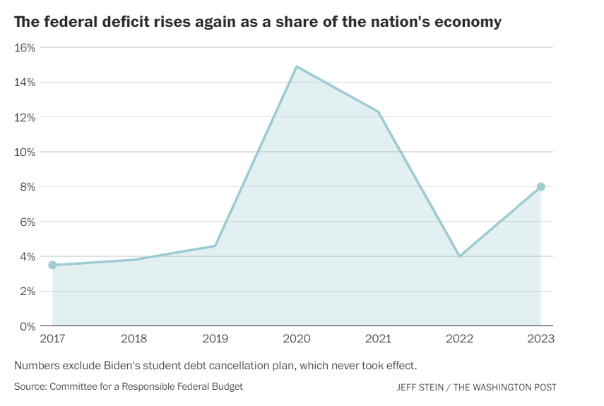 赤字的激增出乎许多经济学家的预期。通常情况下,随着经济增长,赤字会收缩,因为企业和消费者会上缴更多税费,政府不需要花那么多钱来救助失业者。相反,赤字通常会在经济低迷时期扩大。然而,当前赤字激增恰逢经济异常强劲增长时期,失业率处于历史低位,企业利润强劲。