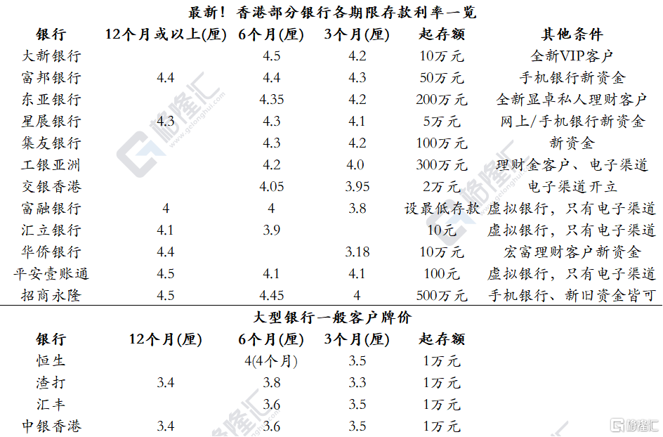 香港地区近一周最少有10家银行降低定期存款利率,且大多集中在3个月的存款期限。例如大新银行将3个月5%的高息调降为4.2%,东亚银行3个月存款利率亦降至4.2%。此外,恒生银行最新将3个月定存的年利率由4.2%减至3.5%,另外新推4个月存期利率为4%。