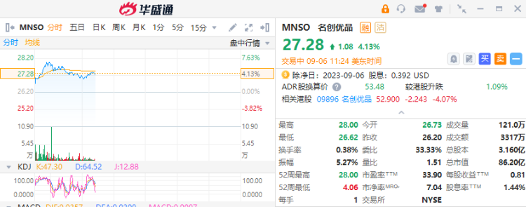名创优品 $MNSO 涨超4%,瑞银发布报告称,在业务扩充下,预计名创优品2023财年至2025财年每股盈利的复合年增长率为26%,上调其目标价至32.5美元,评级“买入”。
