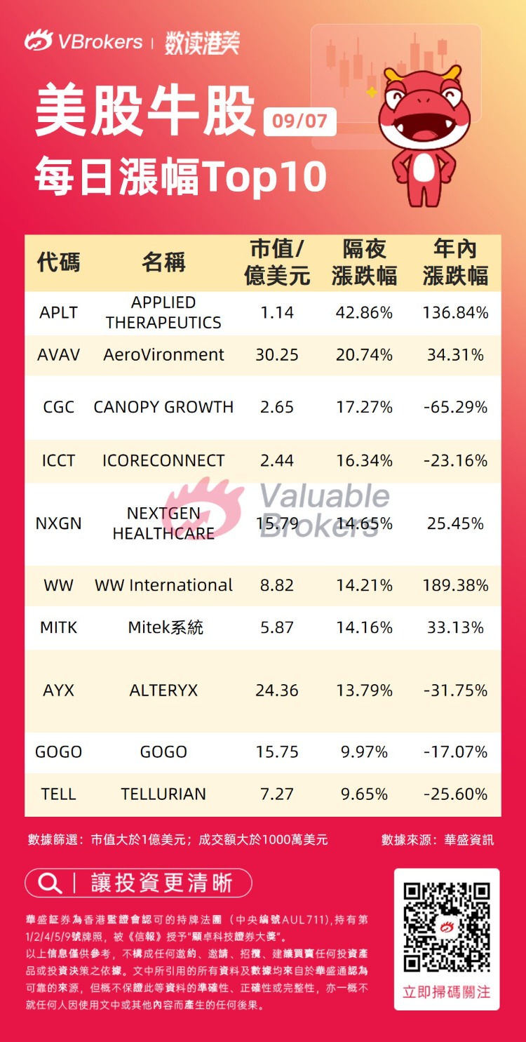 周三美股整体表现较弱,不过,市场中依然有不少“大赢家”。發仔梳理了每日美股涨幅Top10榜单,以下为隔夜美股涨幅靠前的个股: