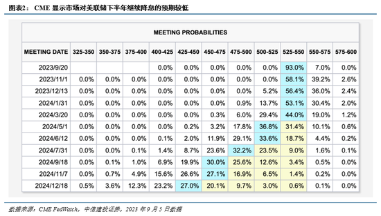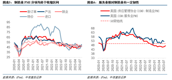二季度的经济数据,初步印证了美联储对经济前景由浅衰退转变为小幅增长的预期。美国8月ISM制造业PMI连续第二个月回升,为今年2月以来新高。然而,47.6的PMI综合指数显示制造业整体仍处于萎缩态势,但萎缩幅度较上月的46.4收窄。制造业PMI与服务业PMI的分化较大,但服务业需求有所走弱。截至7月,美国服务业PMI高于制造业PMI6.5个点,二者分化较6月份缩小。综合来说,温和的经济数据足够支撑美联储7月加息,但由于制造业持续收缩幅度已经较大,美国经济陷入结构性衰退,年内超预期加息的可能性已经较小,将为下半年流动性缓和提供支持。