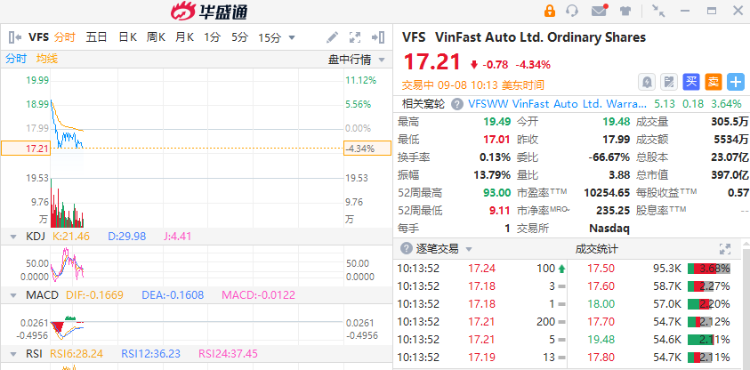 “越南特斯拉”VinFast Auto $VFS 跌超4%,刷新日低至17.01美元。