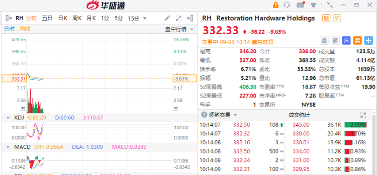 家居用品零售商RH $RH 跌超10%,Q2净利润下降37.3%,指引不及预期。