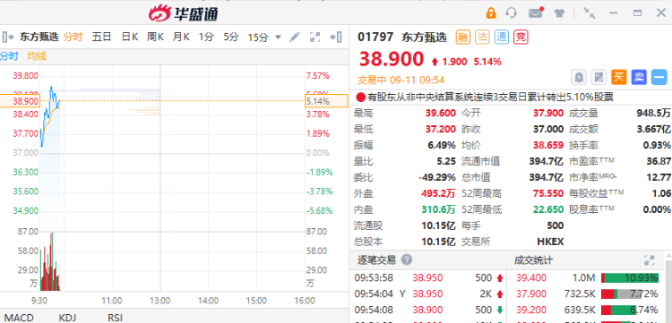 华盛资讯9月11日消息,东方甄选早盘一度走高涨超6%,截至发稿,现涨5.14%,报38.9港元,成交额3.667亿港元,最新总市值394.7亿港元。