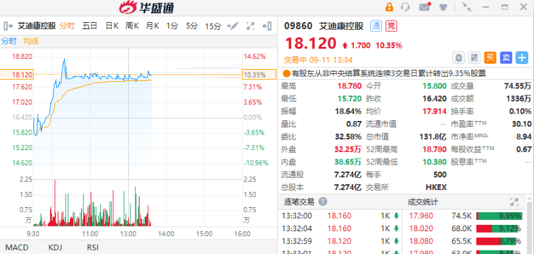 艾迪康控股走强,截至发稿,涨10.35%,报18.12港元,成交额1336万港元。公司股价一度升至18.78港元,创6月上市以来新高。