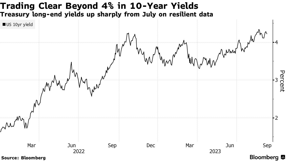在当前美联储加息周期中,作为全球市场的基准利率和房主/企业借贷的关键推动因素,10年期美债收益率超过4%关口的时间已是最长,最近的峰值为4.36%,是自2007年以来的最高水平,美债抛售潮使得彭博国债指数今年处于负值区域。