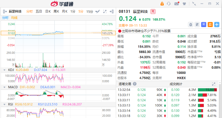 辰罡科技(08131)今日上午复牌,股价持续升高,一度飙升220%。截至发稿,现涨近170%,现报0.124港元,成交额316万港元。公司股价创阶段性新高。