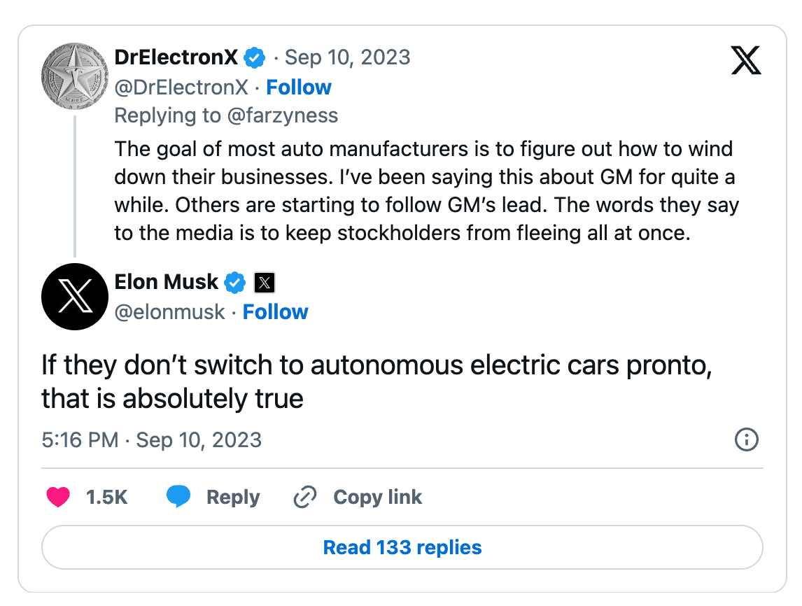 马斯克参加了一场关于传统汽车制造商缓慢入局电动汽车赛道,最终垮台的讨论。其中一个用户写道,