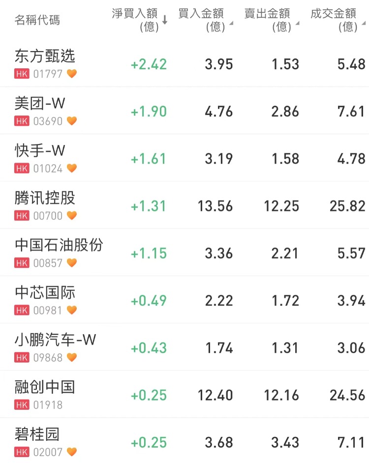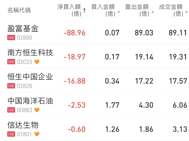盈富基金、南方恒生科技、恒生中国企业分别遭净卖出88.96亿港元、18.97亿港元、16.88亿港元;东方甄选逆势获净买入2.42亿港元。
