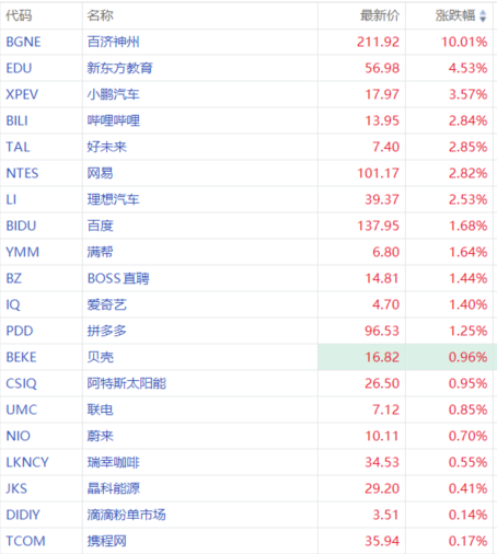 华盛资讯9月11日消息,热门中概股多数上涨,截至发稿,百济神州涨超10%,新东方教育涨超4%,小鹏汽车涨超3%,哔哩哔哩、网易、理想汽车涨超2%,百度、拼多多,蔚来、瑞幸咖啡小幅走高。