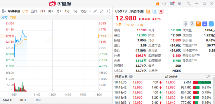 珍酒李渡今日早盘再度走强,股价再创上市新高。截至发稿,涨3.18%,报12.98港元,成交额1.925亿港元。值得关注的是,该股月内已涨近50%。