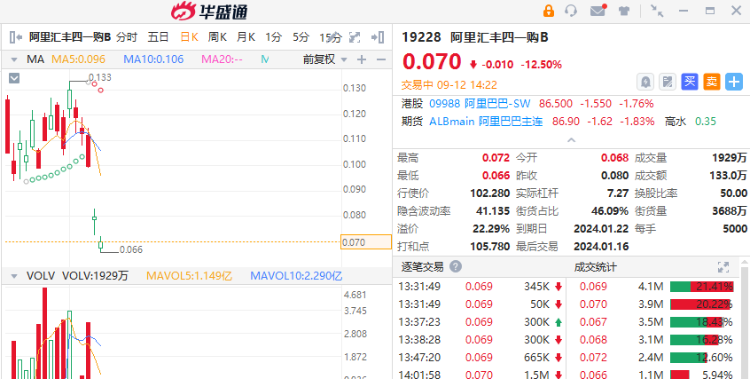 如看好阿里新发展可留意认购证( $19228.HK ),行使价102.28港元,2024年1月到期,实际杠杆7.5倍。