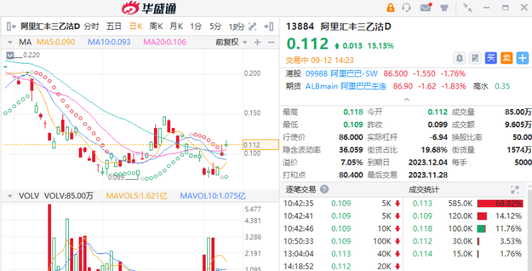 如看淡阿里可留意认沽证(13884),行使价86港元,2023年12月到期,实际杠杆6.6倍。