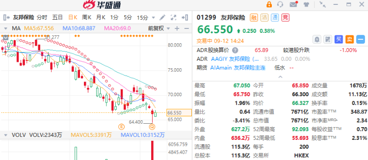 友邦公布昨日(11日)于联交所回购204.82万股,每股作价介乎64.5至66.95港元,涉资约1.35亿港元。对息口敏感的保险股友邦保险( $01299.HK )逆市上升,今早开市初段升0.3%,曾触66.55港元。