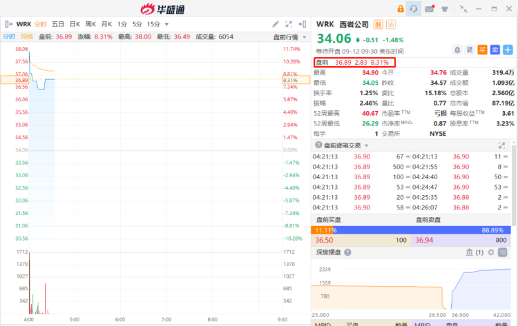 美国纸业和包装巨头西岩公司 $WRK 美股盘前涨超8%,此前同意与包装企业Smurfit Kappa合并,交易价值在112亿美元。