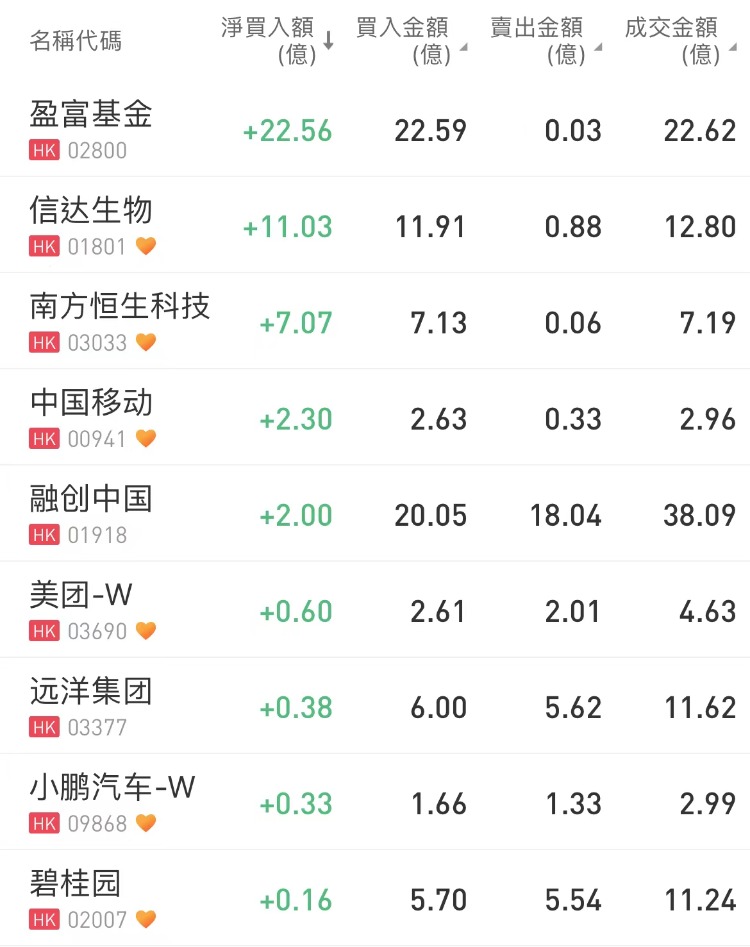 盈富基金、信达生物、南方恒生科技分别获净买入22.56亿港元、11.03亿港元、7.07亿港元;中国海洋石油净卖出额居首,金额为2.47亿港元。