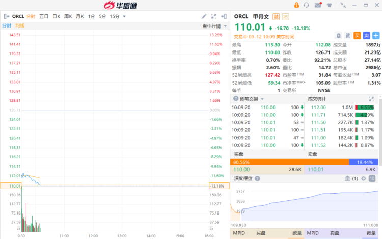 甲骨文 $ORCL 绩后跌超13%,2024财年Q1云业务增速环比放缓至30%,Q2营收指引不及预期。