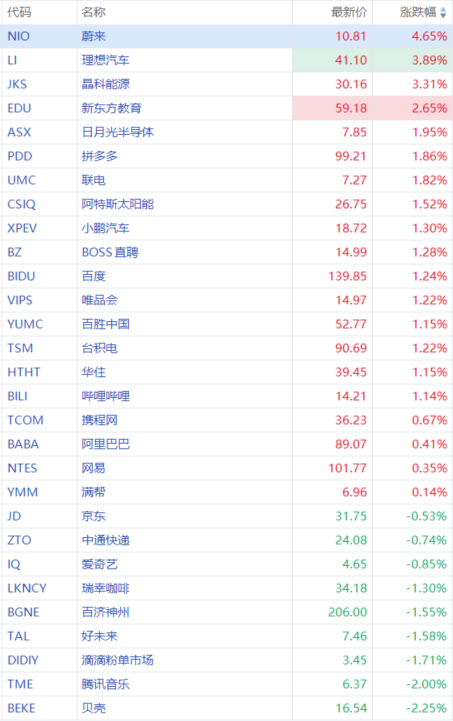 华盛资讯9月12日消息,热门中概股走势分化,截至发稿,蔚来涨超4%,理想汽车涨超3%,新东方教育涨超2%,拼多多、小鹏汽车、百度涨超1%,阿里巴巴小幅上涨;贝壳跌超2%,好未来、百济神州、瑞幸咖啡跌超1%。
