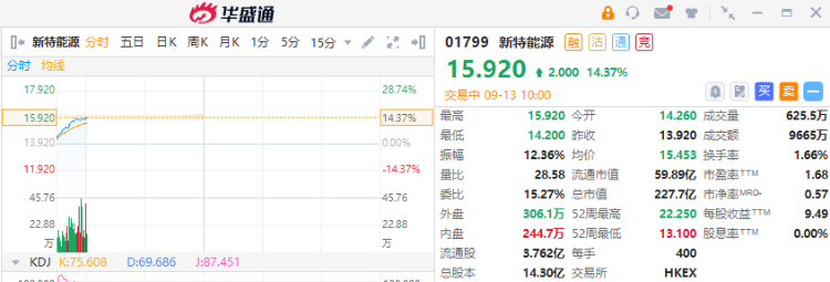 新特能源(01799)早盘涨超14%,截至发稿,涨14.37%,报15.92港元,成交额9665万港元。