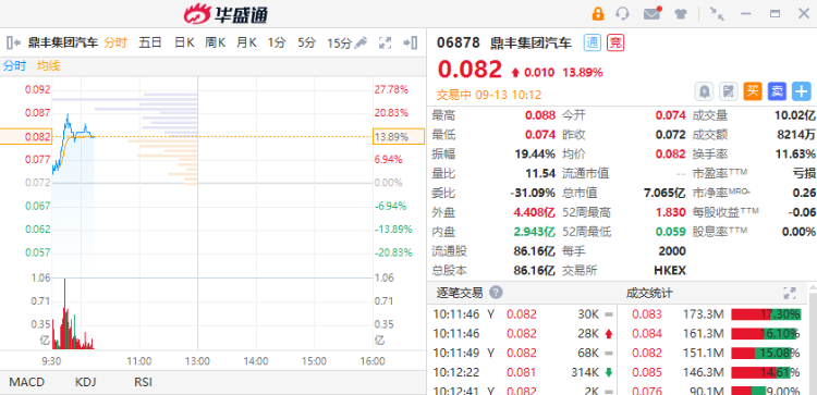 鼎丰集团汽车早盘走强,截至发稿,涨13.89%,报0.082港元,成交额8214万港元。