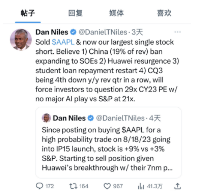 需要指出的是,就在苹果发布iPhone 15的前一周,对冲基金Satori Fund创始人兼投资组合经理丹·尼尔斯(Dan Niles)在推特表示,“已经出售苹果股票,苹果公司现在是他们最大的单一股票空头头寸。”
