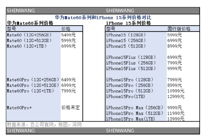 在价格方面,苹果iPhone 15 各个配置的价格都比华为Mate 60系列高。例如,256GB版本、512GB、1TB的Pro系列,iPhone 15 比Mate 60分别贵2500元、4000元、5000元。