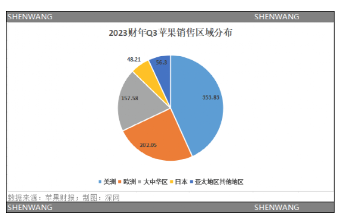 在国内市场方面,大中华区是苹果公司前三大销售区域之一。据苹果2023财年Q3财报(对应2023自然年第二季度)数据显示,这一季度,苹果在大中华区的销售额157.58亿美元,销售占比约为19.26%。
