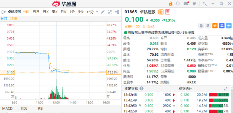 卓航控股(01865)午前放量闪崩,截至发稿,跌75.31%,报0.1港元,成交额4330万港元。盘中低见0.088港元创去年52周新低。