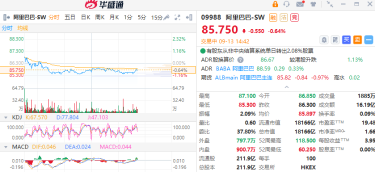 阿里( $09988.HK )由上周二起连跌,今早则早段高见87.15港元后倒跌,最低见85.3港元的过去3周低位。现报85.75港元,跌约0.7%,目前为连续第6日下跌,累计至今跌近8%。蚂蚁集团旗下万里汇公布,今年首八个月跨境支付用户于电商平台1688採购额超过220亿元人民币,按年增长超过50%。