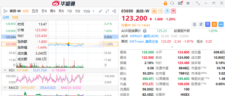 美团( $03690.HK )近日在125港元附近窄幅上落,昨日跌约0.7%,今早继续下跌。早上低开约0.2%后跌幅扩大,最低见122.55港元。现报123.2港元,跌约1.3%。据港交所(0388)股权披露,美团非执行董事南鹏申报,于八月三十一日在场外减持美团约2635.23万 B 类股份,涉资约34.06亿港元。