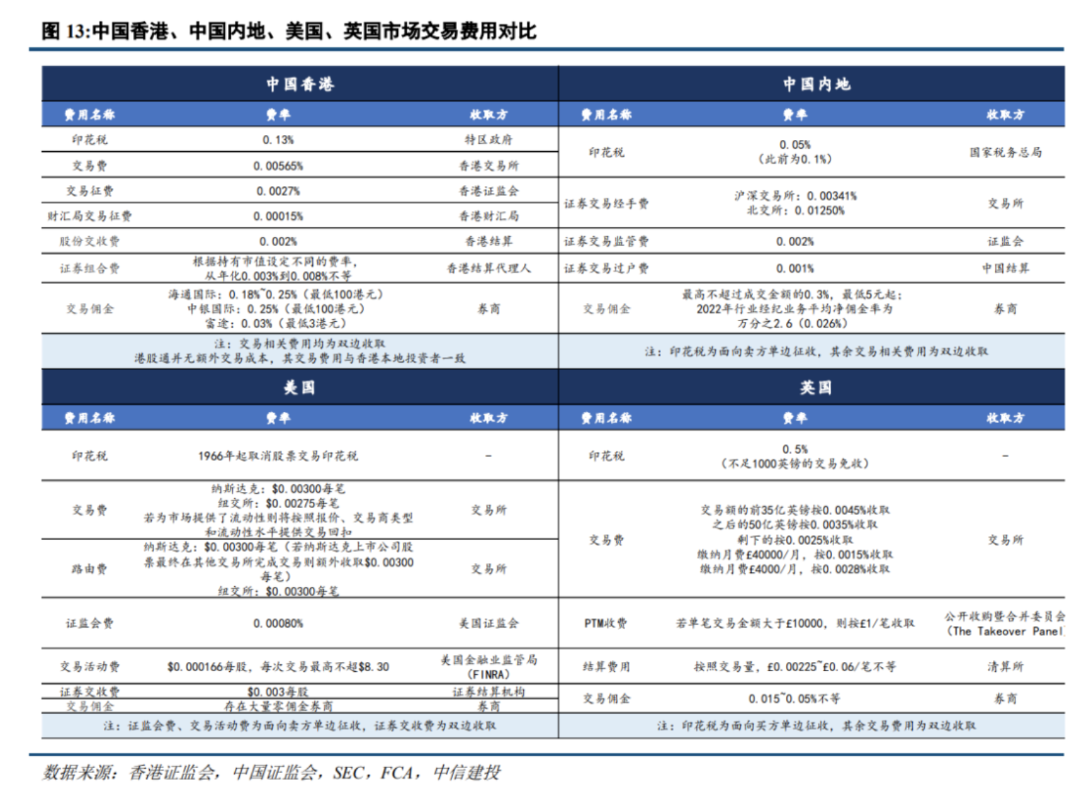 在交易成本上,赵然认为,港交所交易费用与其他主要交易所差距并不明显,但由于香港特区政府所征收的印花税率较高,且在印花税外,港股市场上还存在交易征费和股份交收费等其他费用,因此其整体交易成本显著高于A股和美股。目前香港特区政府收取的股票印花税为0.13%,且面向买卖双方双边收取,合计收取的印花税达到总成交金额的0.26%,是中国内地调降后的5.2倍。