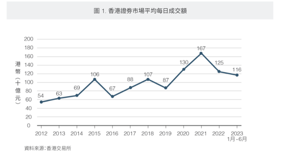 最近两年来,港股流动性持续下降。港交所数据显示,2021年的平均每日成交金额为1667亿港元,而2023年前7个月的港股的平均日成交金额仅为1136亿港元。