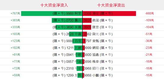淡仓(认沽证及熊证)方面,周三比亚迪股份、友邦保险、中海油等相关淡仓录少量资金净流入;阿里巴巴、美团相关淡仓分别约272万、206万港元资金净流出套现。