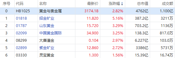 华盛资讯9月14日消息,港股黄金股早盘上扬,截至发稿,招金矿业涨超5%,山东黄金、中国黄金国际涨超3%,大唐潼金、紫金矿业涨近3%,灵宝黄金涨超1%。