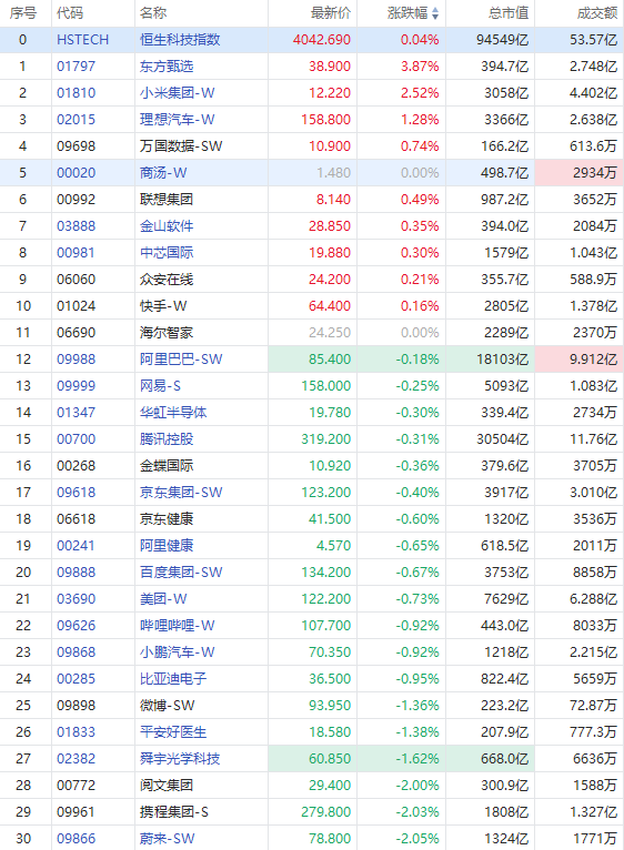 科网股多数走弱,哔哩哔哩-W、美团-W跌近1%,百度集团-SW、京东集团-SW、腾讯控股跟跌;小米集团-W涨超2%。