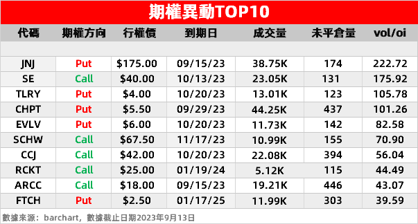 1、强生:股价已连续反弹5个交易日,隔夜其行权价为176美元、9月15日到期的PUT单出现3.9万张成交,仍有押注该股短线回调,当前该合约未平仓量174张。