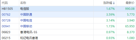 5G概念股午后普涨,中国联通 $00762.HK 上涨3.59%,报5.77港元;中国电信 $00728.HK 上涨3.14%,报3.94港元;中兴通讯 $00763.HK上涨2.58%,报23.85港元;京信通信 $02342.HK 上涨1.83%,报1.11港元;中国移动涨1.15%,报65.95港元。