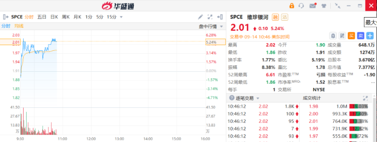 维珍银河 $SPCE 涨5.24%,报2.01美元。维珍银河宣布,“Galactic 04”航班窗口将于10月5日开放,这次飞行计划是太空旅游公司今年的第五次太空飞行,也是迄今为止的第九次太空飞行。维珍银河表示,每月的太空飞行节奏进一步证明了维珍银河提供安全、可重复的太空飞行和变革性客户体验的能力。