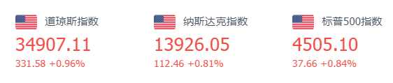 周四美股三大指数集体收涨,道指涨0.96%至一个月高位,纳指涨0.81%,标普500指数涨0.84%。
